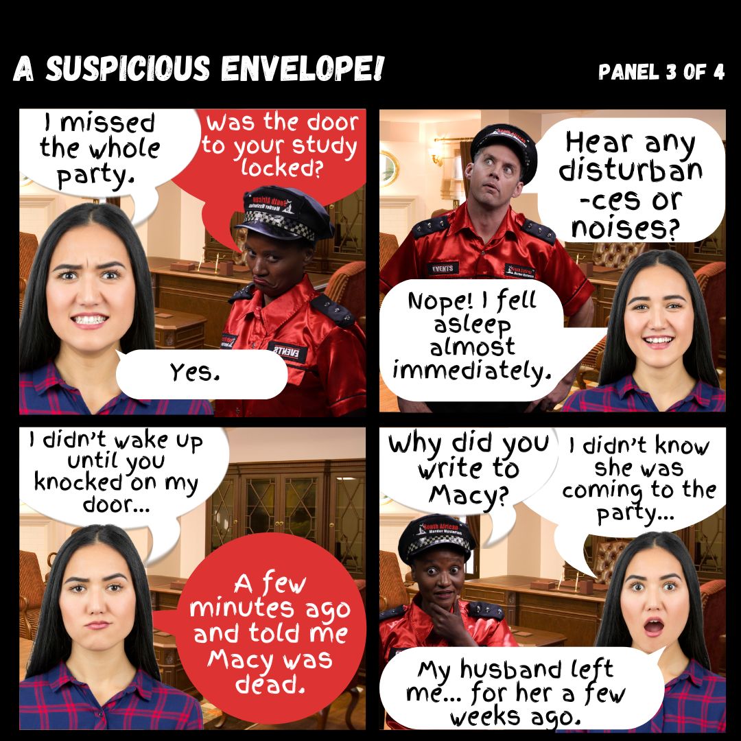 In today’s mystery Dr Silver claims to have been asleep at the time of a murder that took place in her study. Begs the question of who our murderer is… But once again our Field-Marshal worked it out!