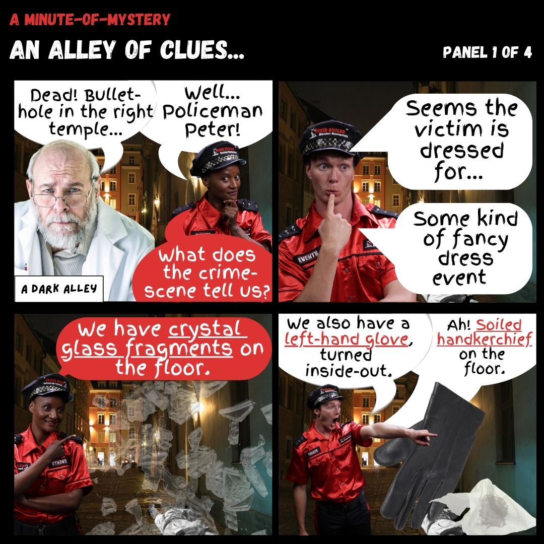 1 1 Minute-Of-Mystery | An Alley Of Clues… Posted in In today’s mystery we have a dead a body in an alley! It’s looks like a suicide until… Share this article: About SA Murder Mysteries We host interactive events that help people connect and have fun.