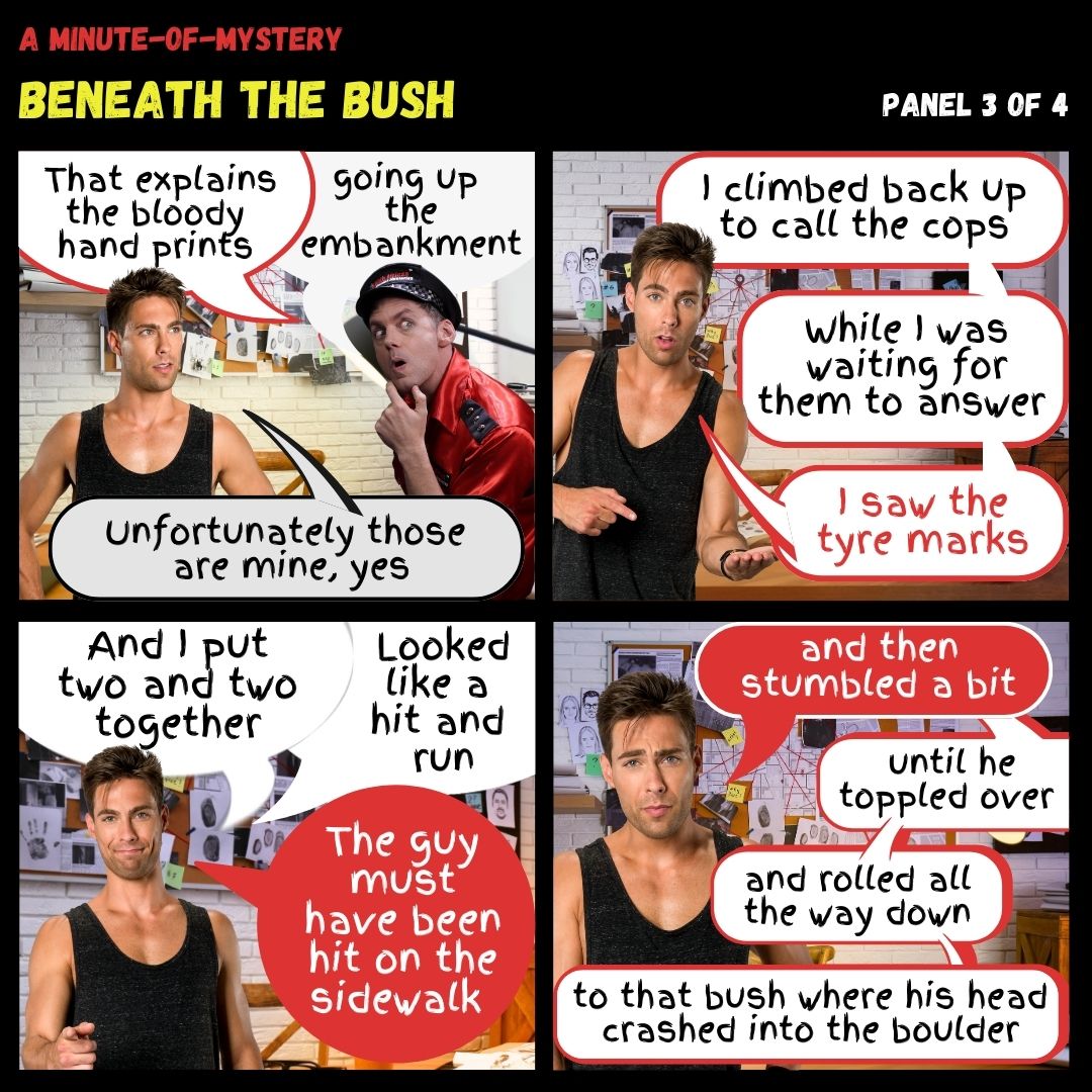 Minute-of-Mystery Beneath The Bush -03 Minute-of-Mystery Beneath The Bush -03 Minute-of-Mystery | Beneath The Bush Posted in At the bottom of a steep embankment, the cocky waiter from Coffee Crusaders meets a bitter end with his head bashed into a boulder… Share this article: About SA Murder Mysteries We host interactive events that help people connect and have fun.