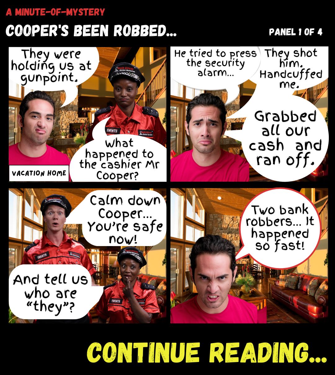 Comic-Minute-of-Mystery-Cover (12) Comic-Minute-of-Mystery-Cover (12) Minute-Of-Mystery | Cooper’s Been Robbed. Posted in Today, Field Marshal Mogau and Policeman Peter’s vacation get disturbed by a bank robbery. But the crime is not what it seems to be… Share this article: About SA Murder Mysteries We host interactive events that help people connect and have fun.