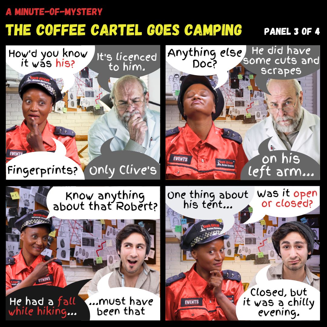 Comic – Story 16.4 – The Coffee Cartel Goes Camping – 3 Comic – Story 16.4 – The Coffee Cartel Goes Camping – 3 Minute-Of-Mystery | The Coffee Cartel Goes Camping Posted in Free 5 Minute Teambuilding Share this article: About SA Murder Mysteries We host interactive events that help people connect and have fun.